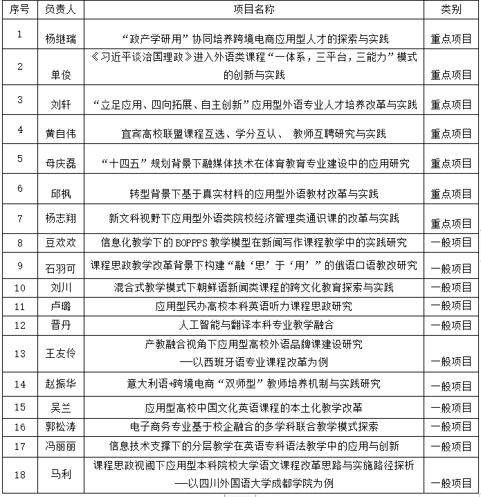 为深入贯彻落实全国教育大会和全省教育大会精神,响应《四川省建设高质量高等教育体系重点行动方案》(2021—2025 年),进一步促进我校教育教学改革工作的深入开展,不断提升人才培养质量,按照学校课题管理的有关规定并结合学校实际情况,组织了2021年度学校教育教学改革研究课题申报工作,共申报了73项课题,经审核,拟立项2021年度学校教育教学改革研究课题项目18项(重点项目7项,一般项目11项),公示期为2021年12月27日至31日。