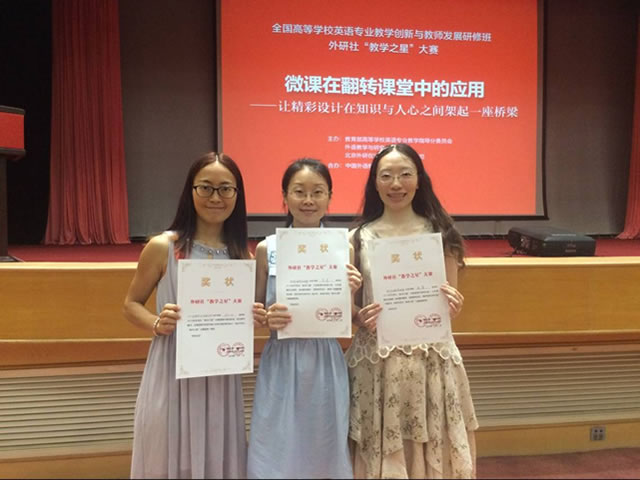 2016年外研社“教学之星”大赛历时一个多月,分十个场次进行,要求参赛教师采用现场讲课形式,展示在翻转课堂中应用微课的教学模式,最后每个场次决出特等奖(冠军2人、亚军4人、季军6人),冠军将参加2016年外研社“教学之星”全国总决赛。我院英语师范系宋莹、赵盈、郑加明,英语外事管理系何益,翻译系唐莹等5名教师在比赛中充分展现了我院教师的出色专业能力和教学水平,从众多优秀选手中脱颖而出,喜获4个特等奖和1个一等奖,其中宋莹老师的参赛成绩在英语专业组复赛中位列第一,荣获复赛冠军,她将参加今年12月在北京举行的全国总决赛,何益老师和赵盈老师分获英语专业组亚军和季军,唐莹老师获大学英语组季军,郑加明老师获英语专业组一等奖。