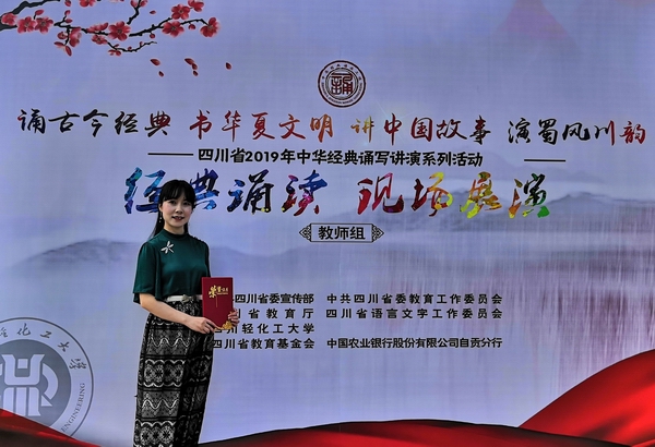 5月21日,由省委宣传部、省教工委、省教育厅等主办的“四川省2019年中华经典诵写讲演系列活动﹒诵经典教师组现场展演”决赛在宜宾举行,我校翻译学院教师谭瑶以出色的表现荣获了本次决赛的三等奖。