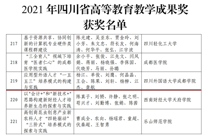 2022年4月8日,根据《教学成果奖励条例》和《四川省教学成果奖励办法》规定,经专家评审、社会公示等规定程序,四川省人民政府公布2021年四川省高等教育教学成果奖获奖名单,我校《应用型外语人才“一五五三”培养模式的构建与实践》荣获二等奖。