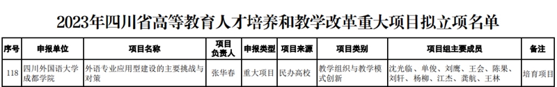 9月7日,四川省教育厅发布了《关于2023年四川省高等教育人才培养和教学改革重大项目拟立项名单的公示》,我校党委副书记、副校长张华春教授主持的《外语专业应用型建设的主要挑战与对策》项目获批为2023年四川省高等教育人才培养和教学改革重大项目(培育项目)。据悉,全省共有100个重大教改项目和21个重大教改培育项目立项。