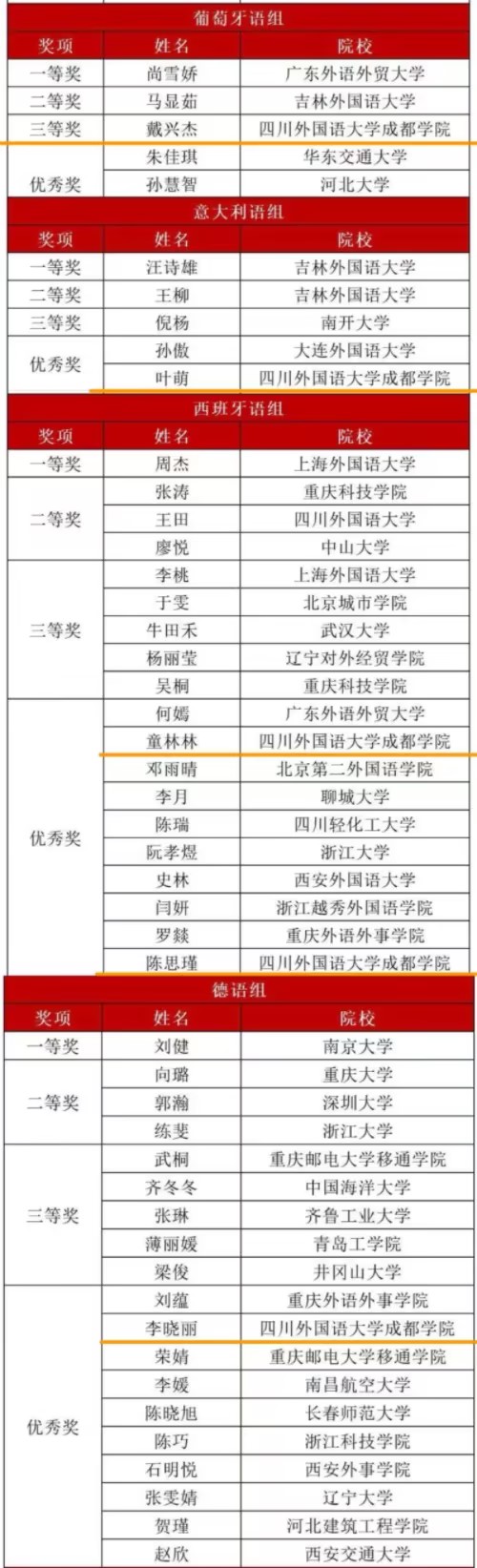 近日,2023年外研社“教学之星”大赛(多语种组)全国总决赛公布获奖名单,我校5名老师获奖。其中,西欧语言学院教师戴兴杰荣获葡萄牙语组三等奖,叶萌荣获意大利语组优秀奖,童林林、陈思瑾荣获西班牙语组优秀奖;中东欧语言学院教师李晓丽荣获德语组优秀奖。