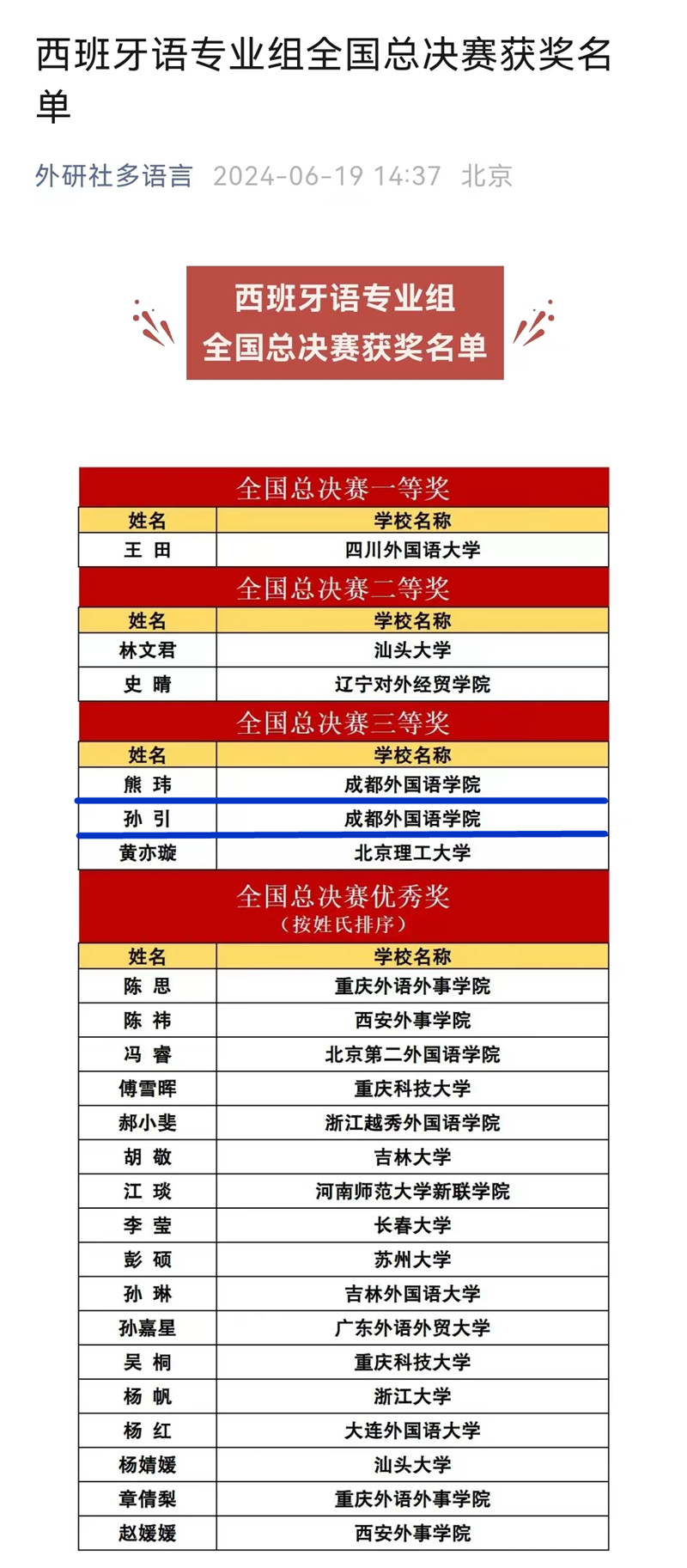 6月下旬,2024年外研社“教学之星”大赛(多语种组)陆续公布获奖名单。其中,西班牙语组、法语组公布了全国总决赛结果:我校西欧语言学院教师熊玮、孙引获得西班牙语专业组全国总决赛三等奖,张盼盼获得法语专业组全国总决赛优秀奖。同时,日语组、俄语组、德语组、韩语组公布了全国复赛结果,我校中东欧语言学院教师林凡迪获得俄语专业组全国复赛一等奖,亚非语言学院教师袁凡淇获得日语专业组全国复赛一等奖、冯然获得大学日语组复赛一等奖,以上三位老师均获得了参加全国总决赛的资格。