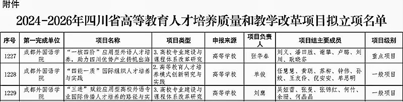 1月21日,四川省教育厅关于2024—2026年四川省高等教育人才培养质量和教学改革项目拟立项名单的公示已结束,我校项目《“一核四阶”应用型外语人才培养,助力四川优势产业扬帆出海》入选重点项目,《“四能一质”国际组织人才培养与实践》《“三进”赋能应用型高校外语专业国际传播人才培养的路径与实践》入选一般项目。