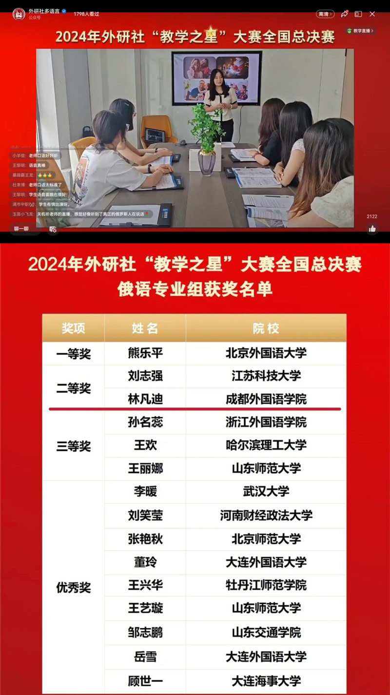 暑假期间,由北京外国语大学中国外语与教育研究中心、北京外国语大学中国外语教材研究中心、北京外国语大学中国外语测评中心、外语教学与研究出版社共同举办的2024年外研社“教学之星”大赛(多语种组)俄语、日语全国总决赛相继举行。我校中东欧语言学院教师林凡迪、亚非语言学院教师袁凡淇分别获得俄语专业组全国总决赛二等奖、日语专业组全国总决赛优秀奖的佳绩。
