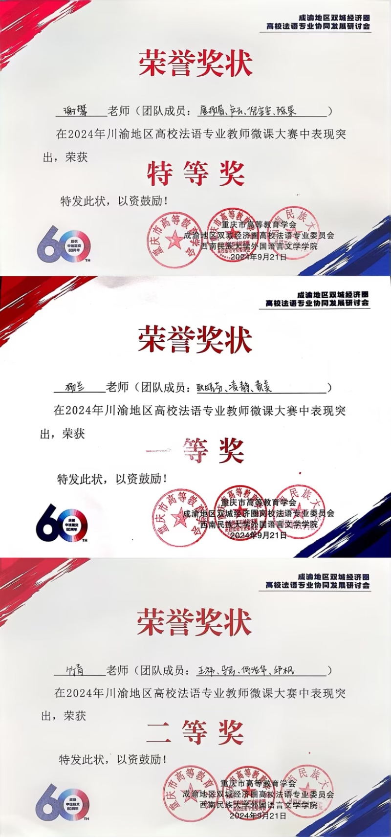9月20日-22日,成渝地区双城经济圈高校法语专业协同发展研讨会在西南民族大学举行。会上公布了川渝地区法语教师微课大赛的获奖结果,我校西欧语言学院法语专业教师团队组建的三支参赛队伍均荣获佳绩。其中,谢攀团队(团队成员:唐扬眉、卢云、倪安安、陈果)作品《如何使表达生动形象——隐喻的妙用》荣获特等奖,杨兰老师团队(团队成员:耿晓芬、凌静、黄美)作品《讲述扶贫攻坚故事—基于PREP原则培养法语专业学生叙述能力》荣获一等奖,竹青老师团队(团队成员:王祎、马思、何治华、邱枫)作品《用法语讲中国故事〈精卫填海〉》荣获二等奖。