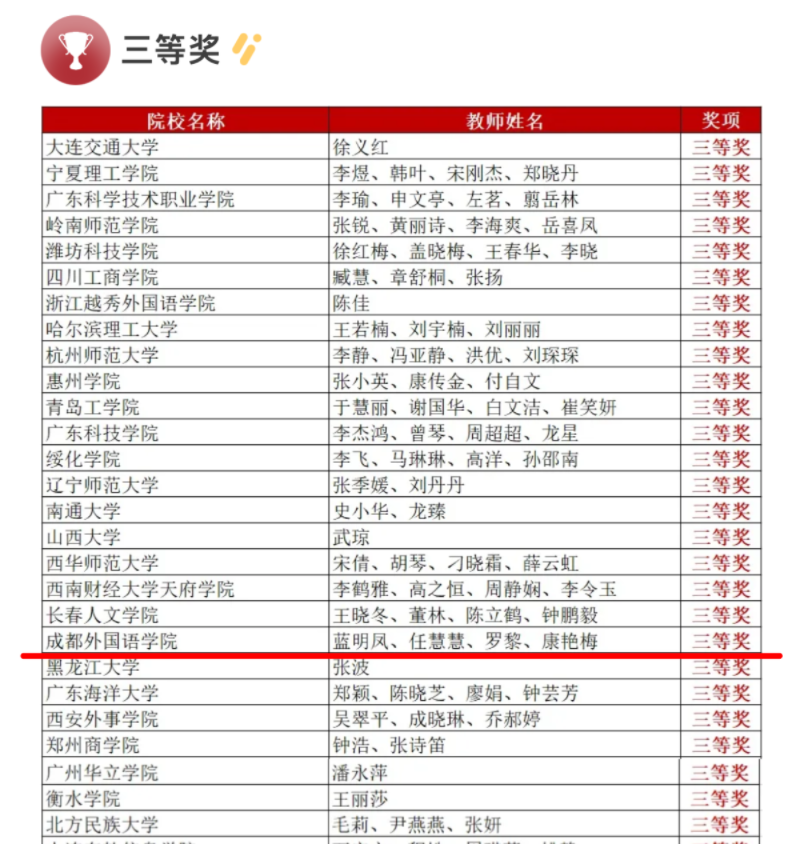 12月28日,由北京外国语大学中国外语教材研究中心、中国日语教学研究会、高等学校大学外语教学研究会日语分会和外语教学与研究出版社联合主办的2024“外研社杯”全国高校日语学科课程思政教学设计大赛(日语专业组、大学日语组)公布了获奖名单,由我校亚非语言学院日语专业教师蓝明凤、任慧慧、罗黎、康艳梅组成的教师团队荣获日语专业组全国三等奖。