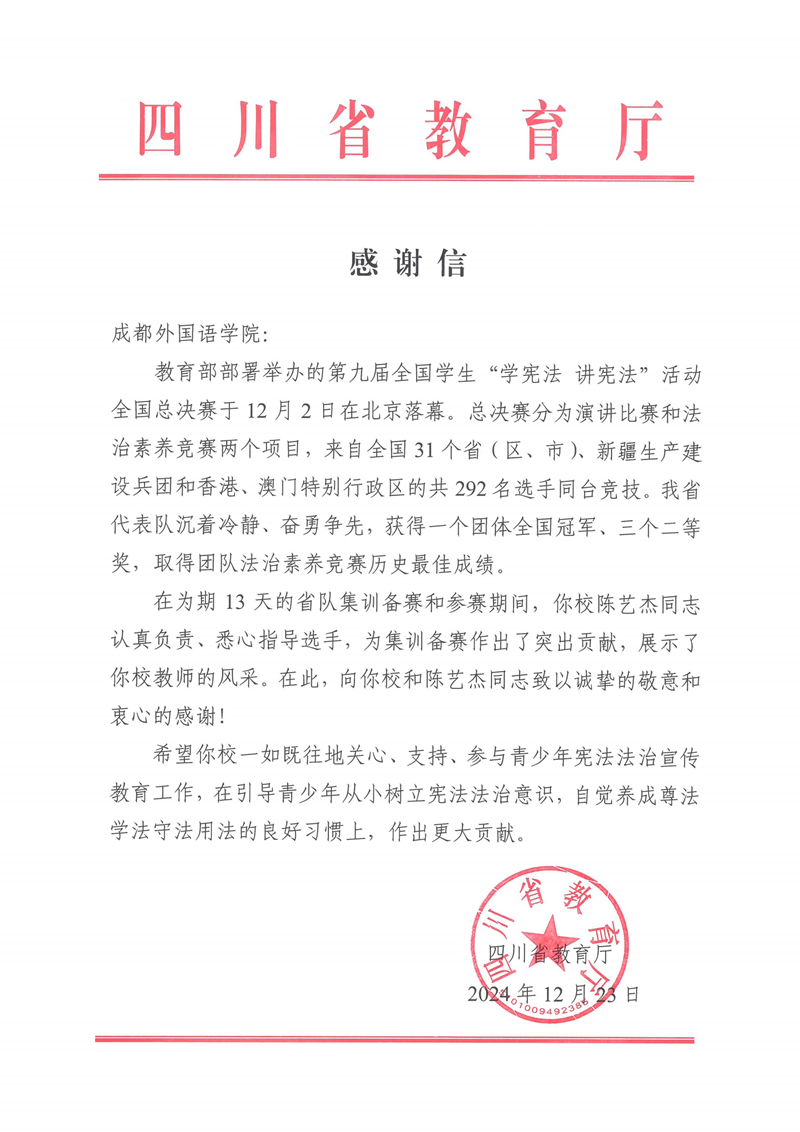 12月2日,由教育部举办的第九届全国学生“学宪法讲宪法”活动全国总决赛在北京落幕,四川省代表队获得一个团体全国冠军、三个二等奖,取得了团队法治素养竞赛历史最佳成绩。我校国际传媒艺术学院播音与主持艺术专业教师陈艺杰受邀担任了四川省代表队指导教师,在为期13天的省队集训备赛和参赛期间,她认真负责、悉心指导选手,为集训备赛作出了突出贡献,展示了我校教师的专业素养和良好风采。为此,四川省教育厅于12月23日向我校发来感谢信,向学校和陈艺杰老师表示诚挚的敬意和衷心的感谢。我校将一如既往地关心、支持、参与青少年宪法法治宣传教育工作,在引导青少年从小树立宪法法治意识、自觉养成尊法学法守法用法的良好习惯等方面作出更大贡献。