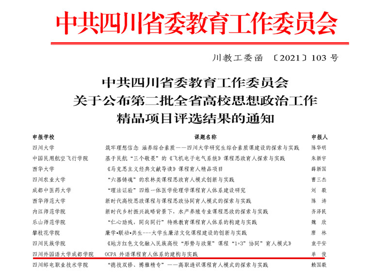 近日,中共四川省委教育工作委员会公布了第二批全省高校思想政治工作精品项目评选结果,经各高校申报、专家组评审、教育工委审定、遴选产生第二批精品项目67项、培育项目25项。我校单俊副教授主持的《OCPA外语课程育人体系的建构与实践》获批课程育人精品项目。