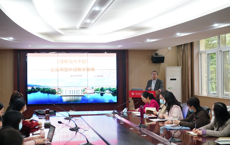 11月24日下午,我校在会议室(一)举行“深入理解当代中国 培养国际传播人才”研讨会。副校长沈光临,外语教学与研究出版社西南信息中心市场主管侯璐璐,教务处、教育教学品牌部等部门负责人,各学院教师代表参加研讨会。