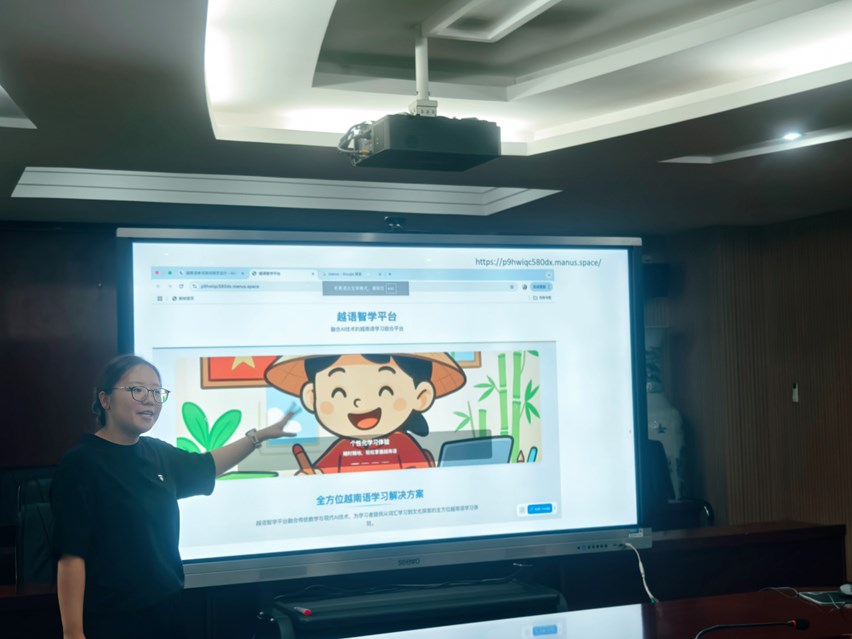 黄聪老师则以越南语教学为例,分享了利用Manus平台打造专属数字化教学解决方案的成功实践。越南语智学平台有效整合了分散的越南语教材、影音、文化资料等,构建起系统化的学院专属数字资源库,并利用智能标签实现资源的精准检索与高效管理。师生互动学习体验升级,平台深度集成AI技术,提供单词测试系统、数字人课程、学习社区与师生直播等个性化学习路径推荐功能,将传统单向传授转变为强交互、重反馈的沉浸式学习体验。黄老师的案例为我校丰富的小语种教学提供了可复制的数字化范本。该平台显著解决了小语种学习资源相对匮乏、互动实践机会有限等痛点,有力推动了非通用语教学的现代化转型和特色化发展。